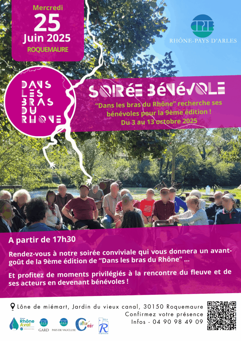 Nous vous donnons rendez-vous mercredi 25 juin 2025 à la lône de miémart, Jardin du vieux canal 30150 Roquemaure afin de partager un moment convivial. Celui-ci sera l’occasion idéale pour découvrir l’événement « Dans les bras du Rhône ».