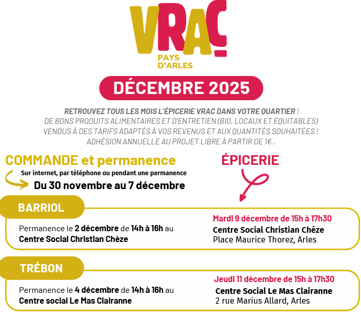 C’est dans ce contexte que le CPIE s’est rapproché de l’association VRAC pour développer des groupements d’achats au sein des QPV du Pays d’Arles. À la suite d’une étude préliminaire visant à analyser le contexte et à vérifier l’adéquation du projet, VRAC s’est d’abord développé au Trébon et dans le village d’Orgon (mars 2023) puis à Barriol (novembre 2023). Chaque création de groupement s’est faite en cohérence avec les besoins des habitant·e·s et en lien étroit avec les structures présentes dans chaque quartier.